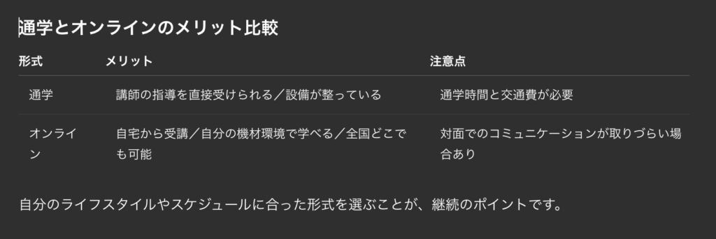 オンラインなら自宅から気軽に受講でき、通学型なら講師と直接やり取りできるメリットがあります。どちらが自分に合っているかを考えて選びましょう。